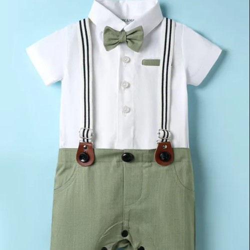 Cotton Knit Half Sleeves Solid Color Party Romper With Bow & Suspenders comfort